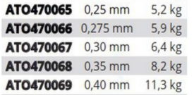 | DIAMETRO | 0,22,5, 0.25, 0.27,5, 0.30, 0.35, 0.40, 0.45, 0.50, 0.60, 0.70 |